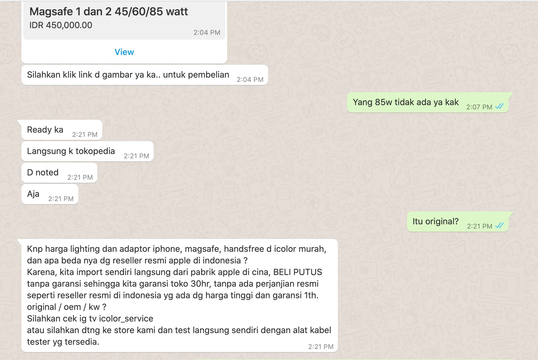 Saya menemukan beberapa seller di marketplace dengan jaminan Magsafe yang mereka jual original. Dan yang membuat saya tertarik adalah seller dengan nama “iColor”, seller tersebut menjual Magsafe2 seharga Rp 450.000 dengan jaminan original. Selain itu alasan saya membuat saya tertarik dengan seller “iColor” ini karena Gibran yang merupakan Putra dari presiden kita saat ini, menjadi salah satu pemiliki “iColor”.