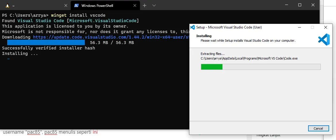 Saya coba melakukan installasi vscode menggunakan WinGet, dengan menulis perintah winget install vscode , begini kira-kira prosesnya
